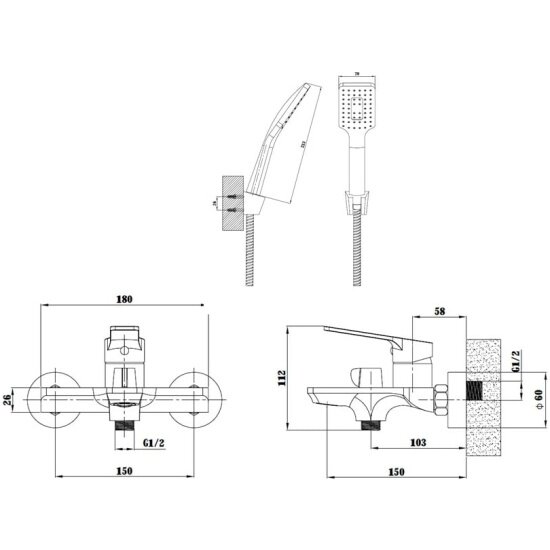 | Комплектация | эксцентрики / отражатели / шланг душевой (в мет. оплетке - 150см.) / лейка душевая(1 режим) / настенный держатель для лейки |