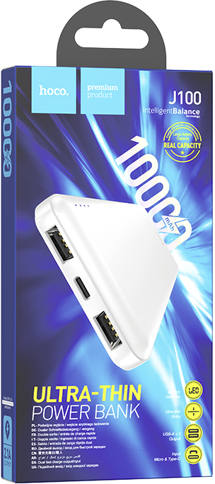 Портативный аккумулятор hoco J100 10000mAh, вх.: Micro-USB/USB-C, вых.: 2 x USB-Af, LED, белый