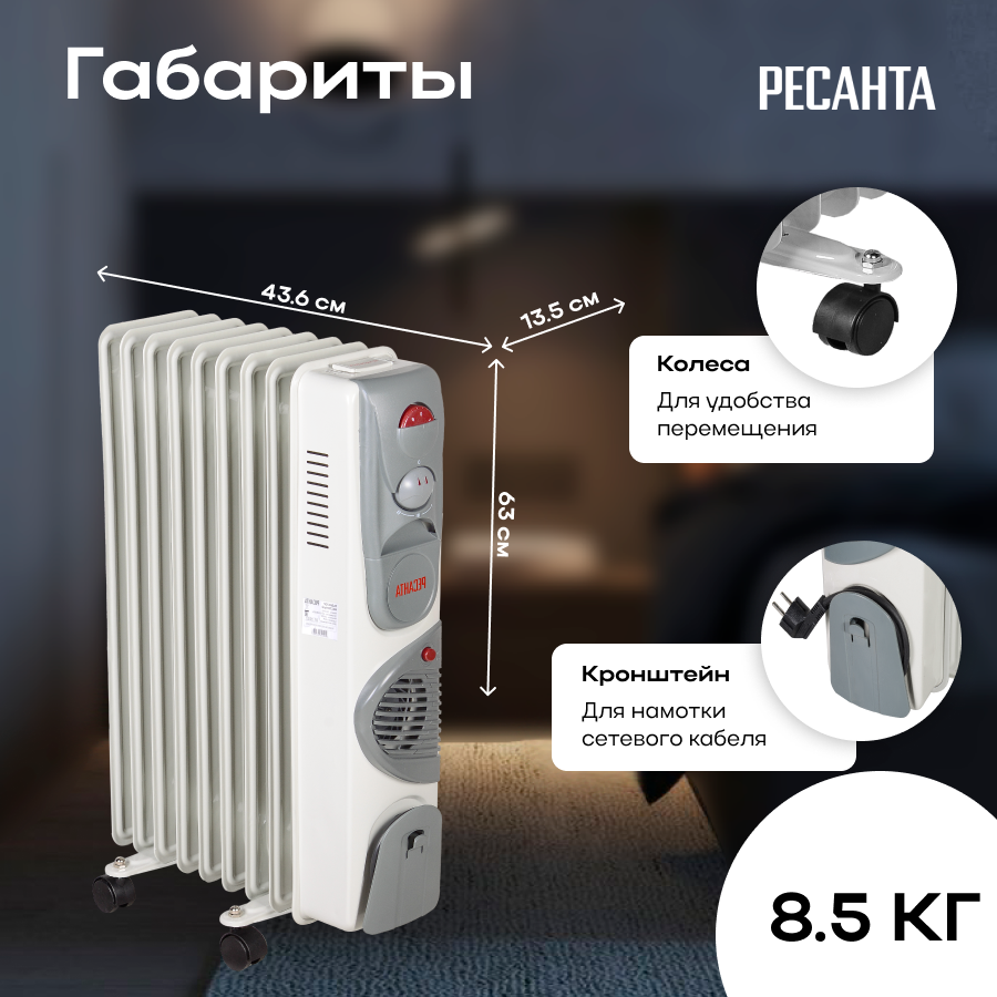 Масляный радиатор РЕСАНТА ОМ-9АВ// 2400Вт, 20кв.м., 9 секций, обогреватель для дома, дачи, гаража, склада. Подарок маме, папе, бабушке, дедушке