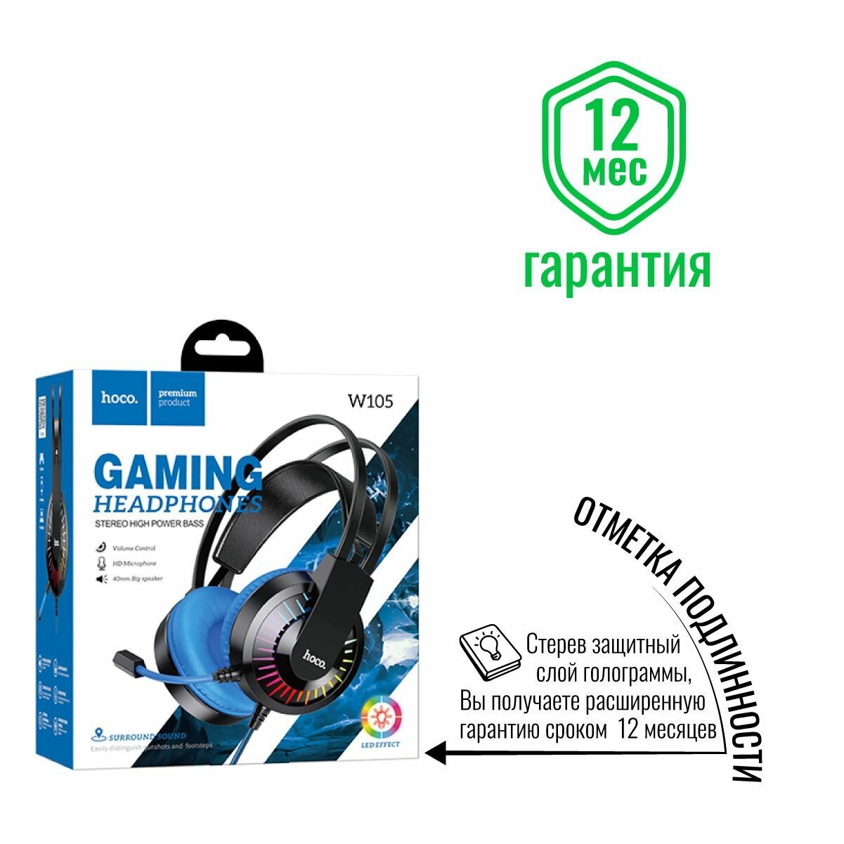 Наушники Hoco Hoco W105 полноразмерные игровые с МК с LED (Blue)