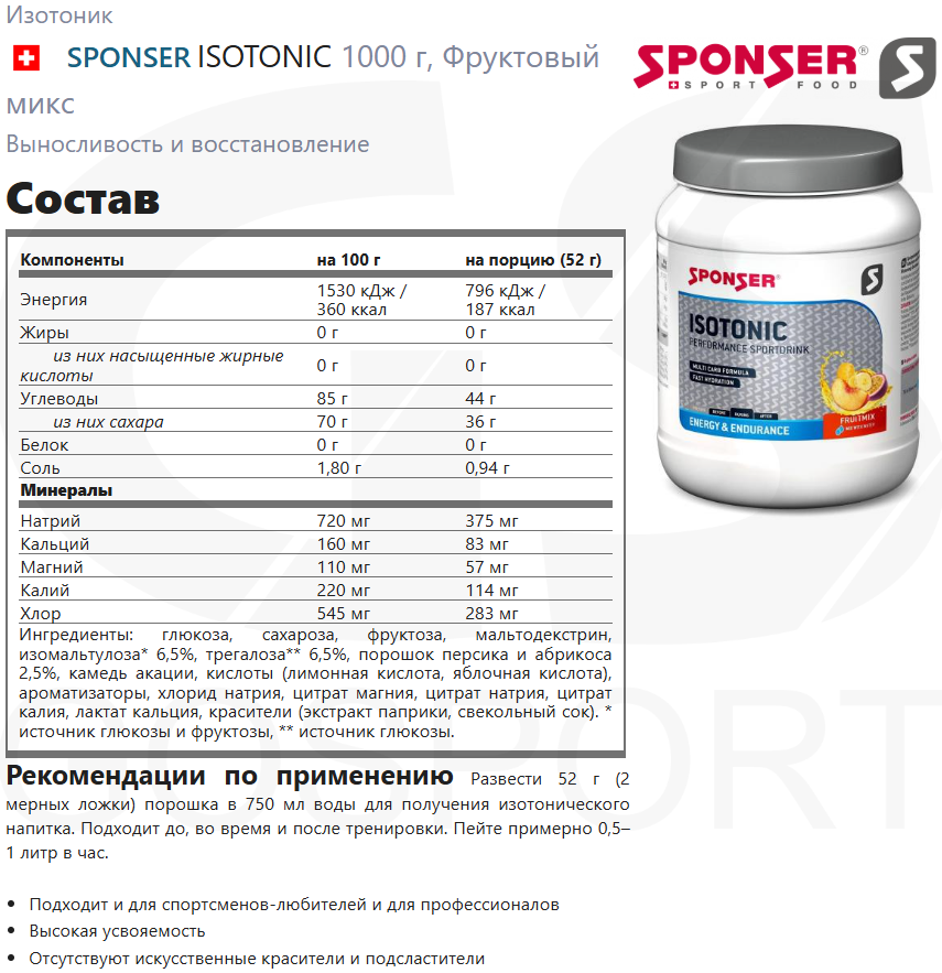 Изотоник SPONSER ISOTONIC 1000 г, Фруктовый микс интересное: