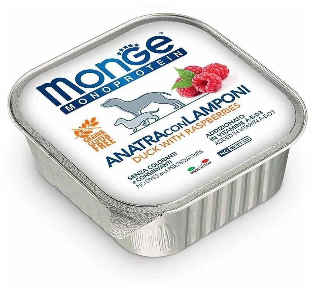 Влажный корм для собак Monge Dog Monoprotein ANATRA con LAMPONI, беззерновой, утка, с малиной, 3 шт. х 150 г