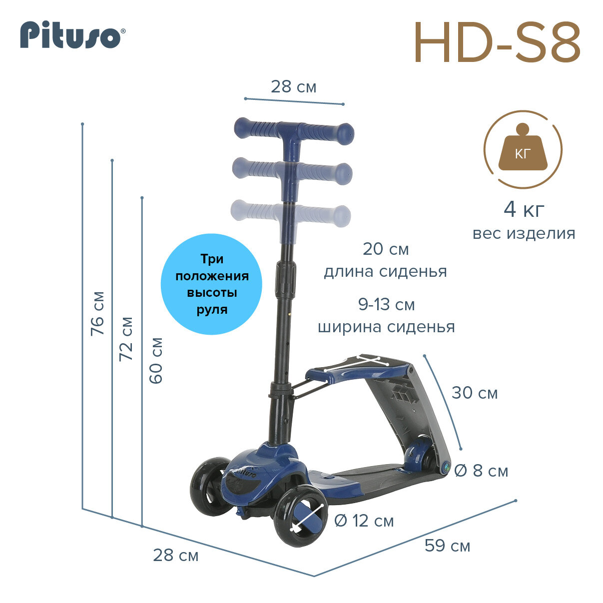 Самокат трехколесный детский Pituso HD-S8, беговел с сиденьем, регулировкой высоты руля, светящиеся колеса, цвет синий