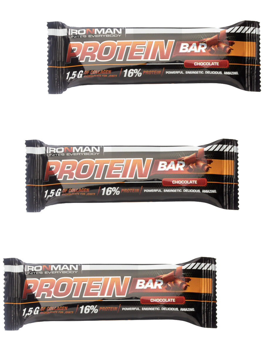 Купить Ironman Protein bar с Коллагеном (Шоколад) 3х50г / Протеиновый батончик в шоколаде для набора мышечной массы женщин и мужчин
