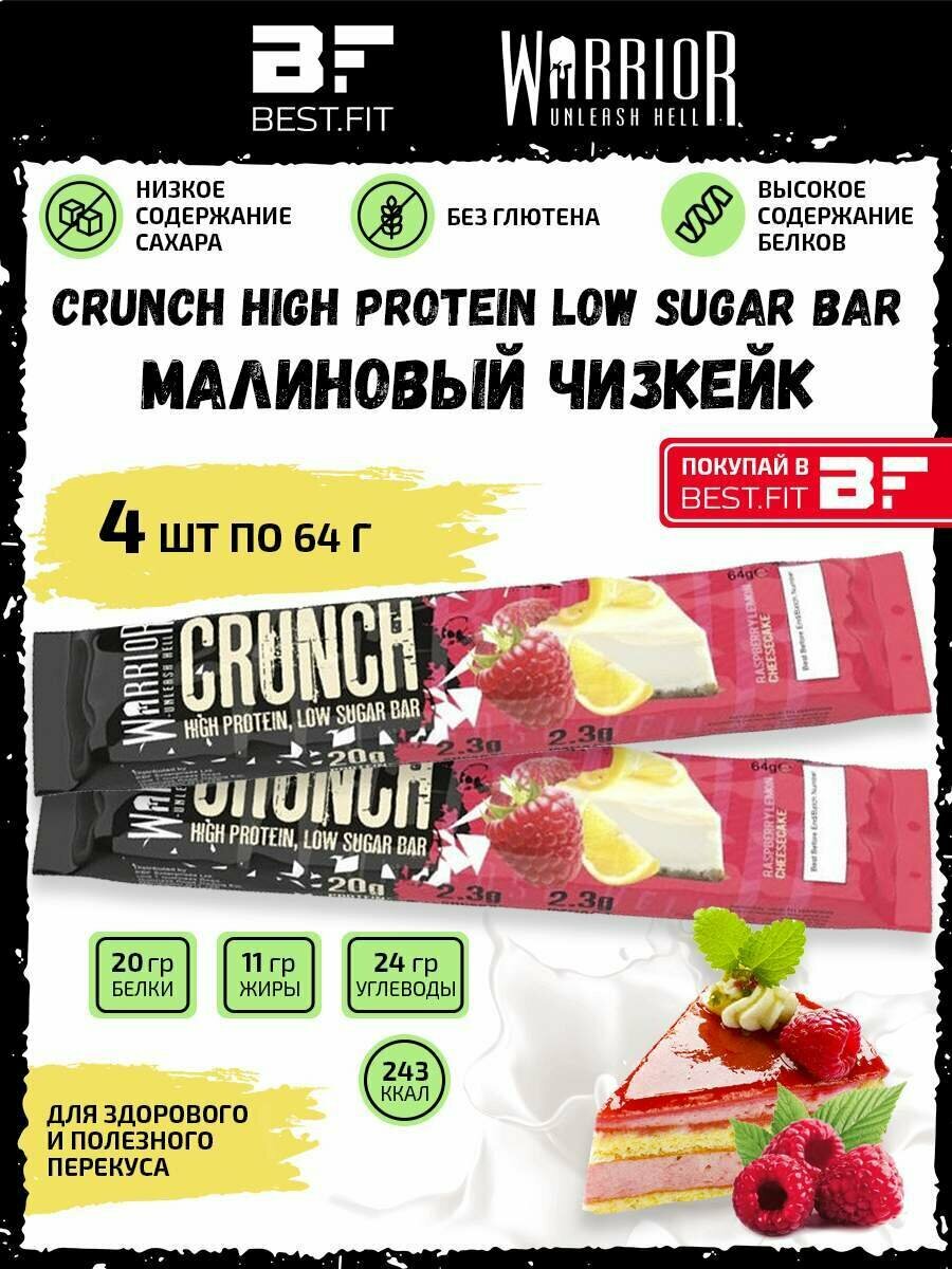 Купить Warrior Протеиновый батончик Crunch High Protein Bar 64г х 4шт (Малиновый чизкейк) 20г белка/ Для похудения и набора мышечной массы