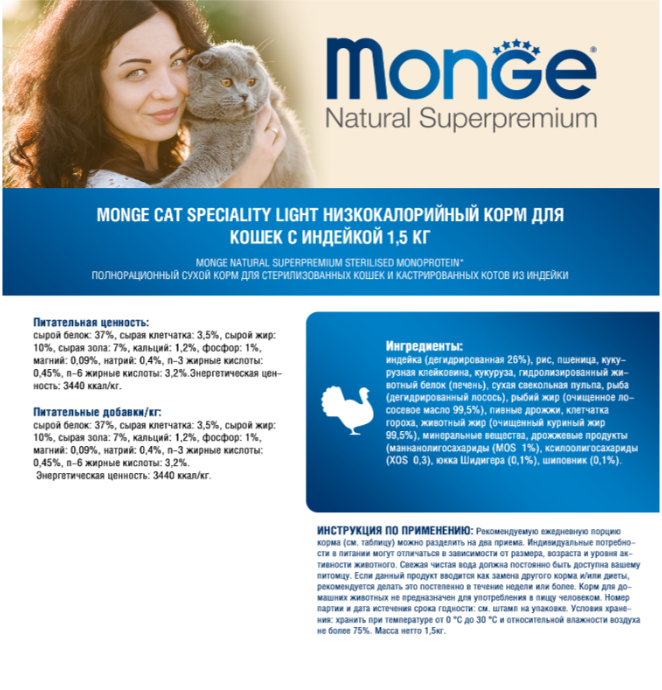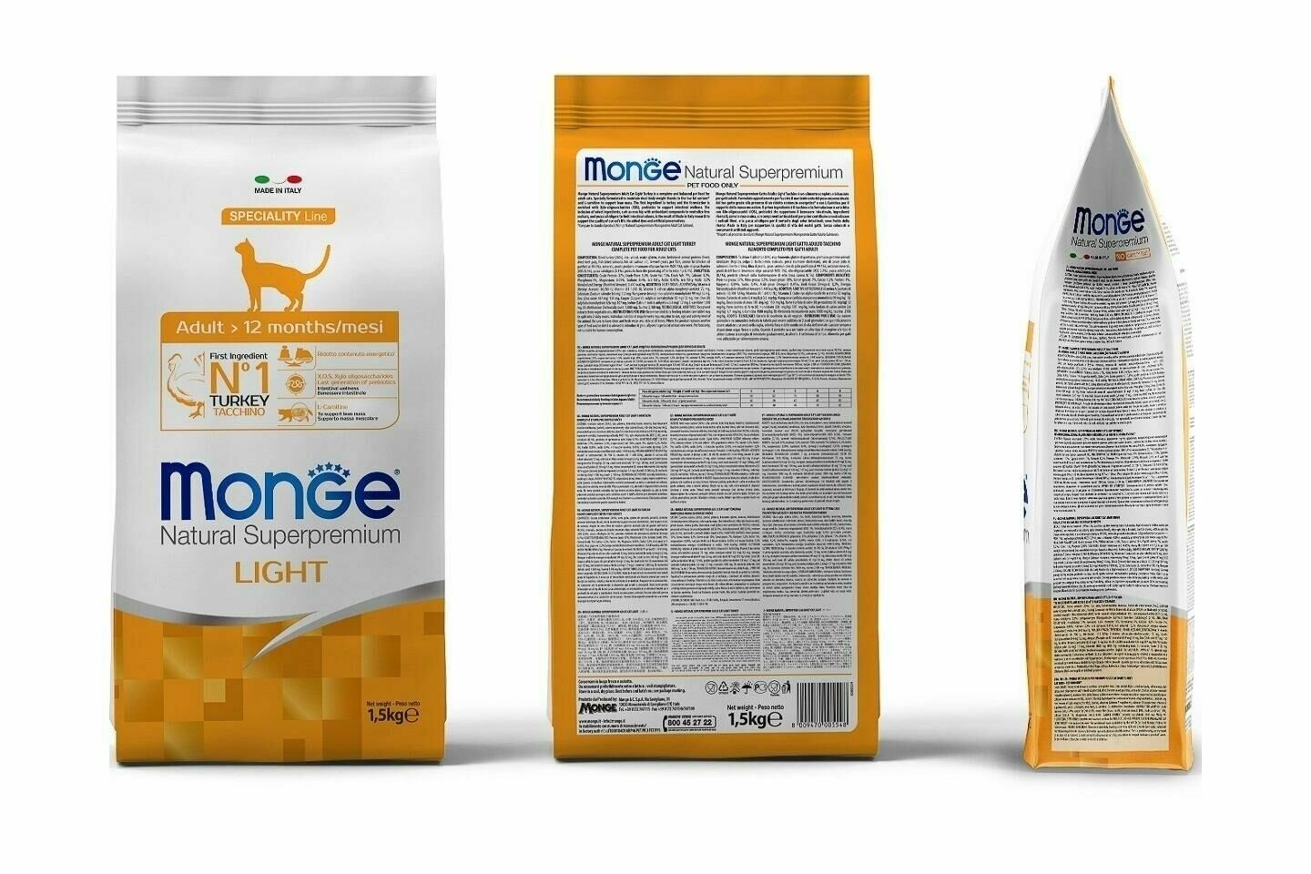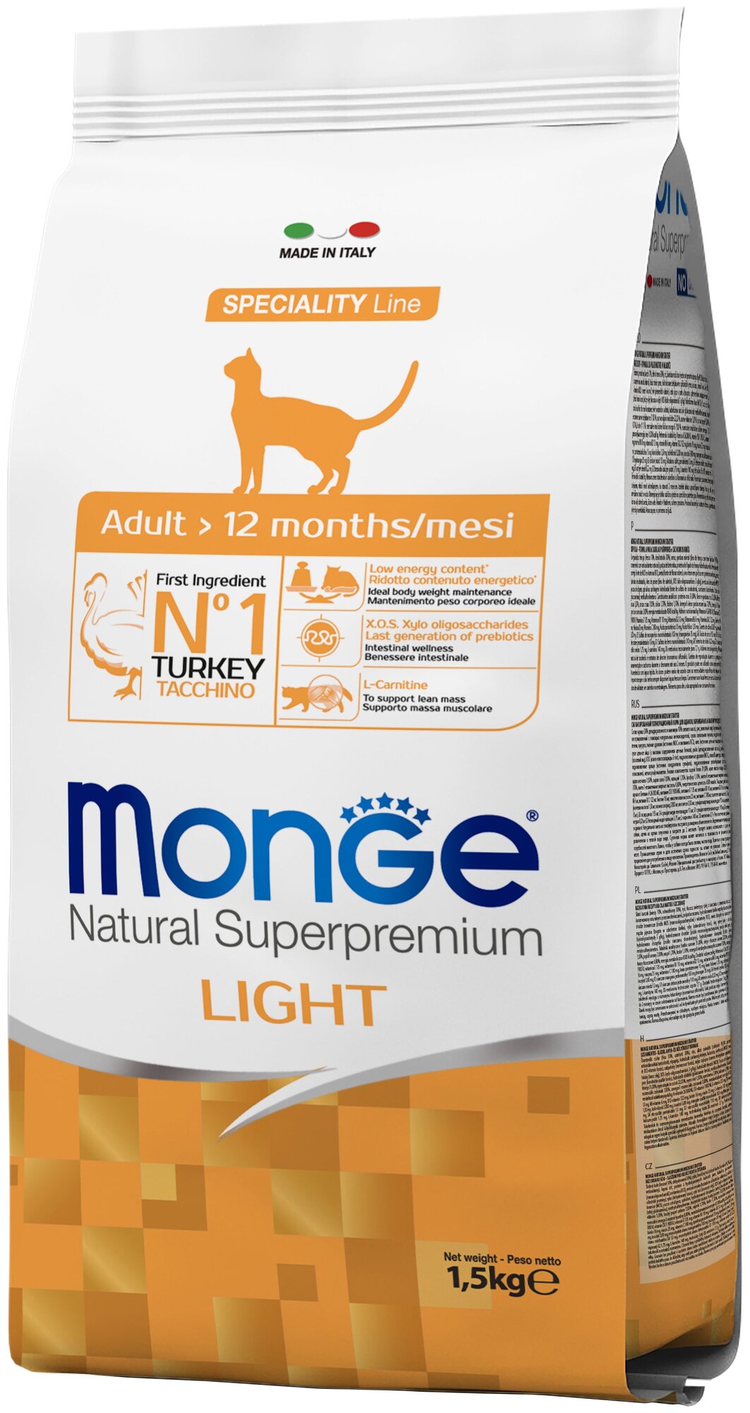 Корм Monge "Speciality Line Light", для кошек, сухой, низкокалорийный, индейка, 1.5кг