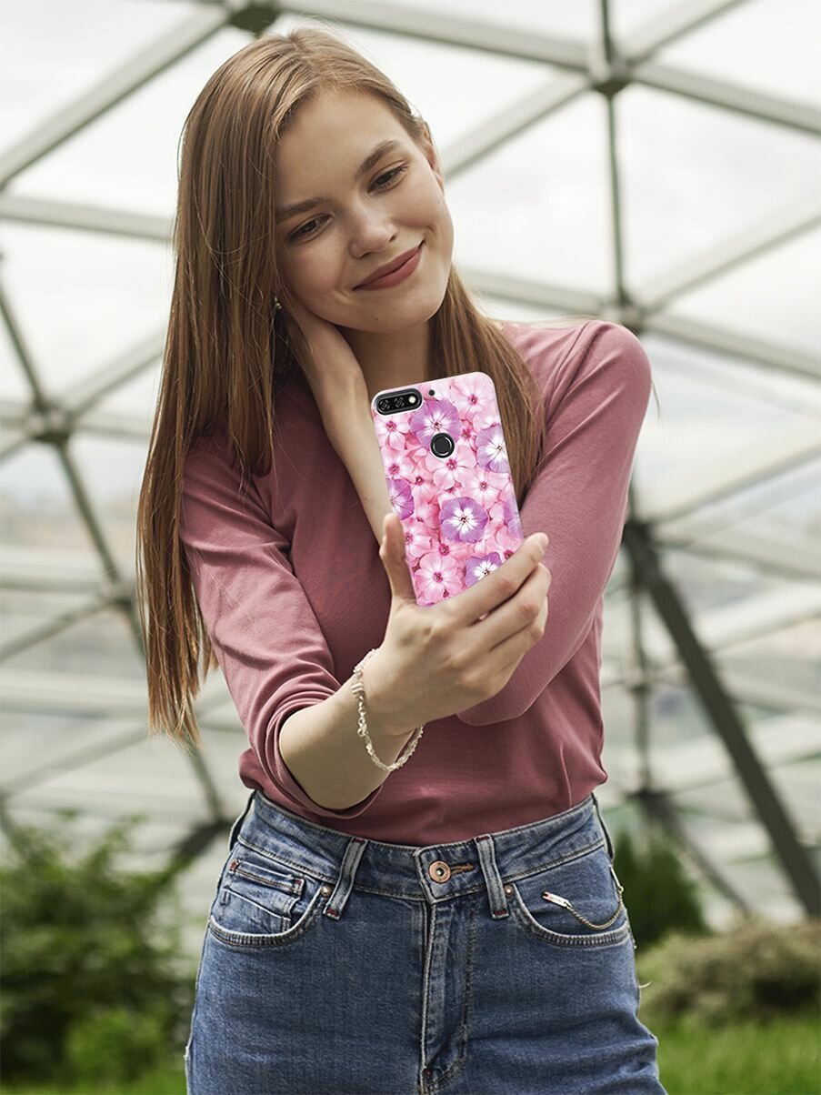 СохранитьСиликоновый чехол на Honor 7C / 7A Pro / Huawei Y6 Prime (2018) / Хуавей У6 Прайм 2018 / Хонор 7А Про / 7С с принтом "Розовые и фиолетовые филаки" интересное:
