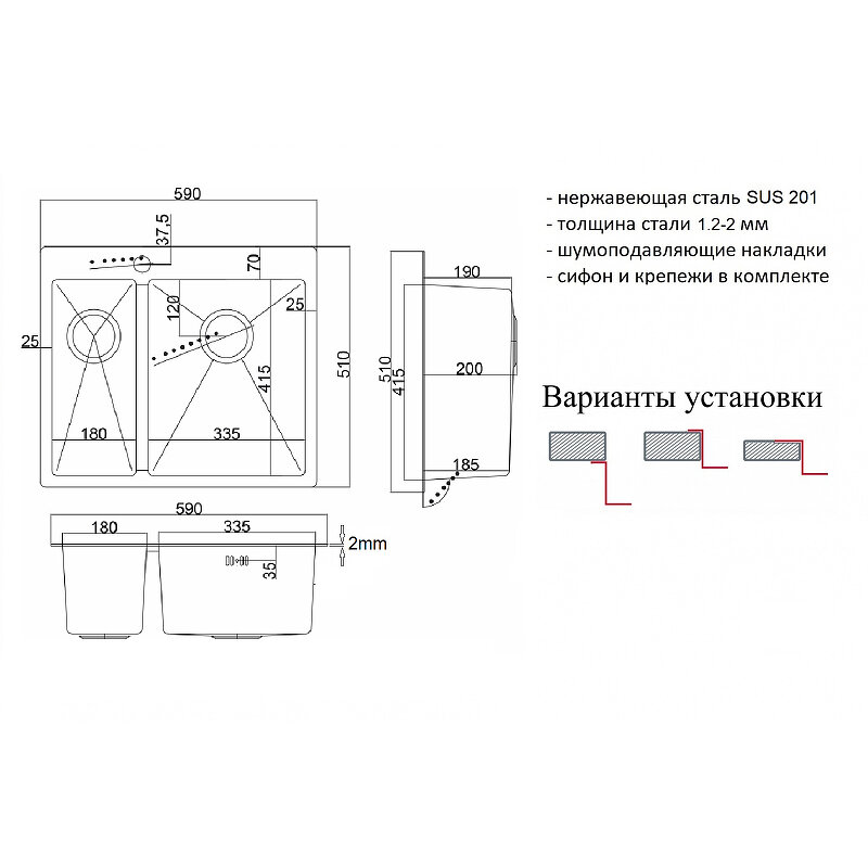 Мойка кухонная ZORG ZL R 590-2-510 R GRAFIT две чаши, основная справа, графит черная, толщина 1,2 мм интересное: