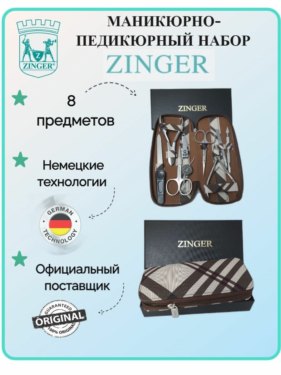 Маникюрный набор, ZINGER, MS-7106, 8 предметов, чехол клетка/овалы, коричневый