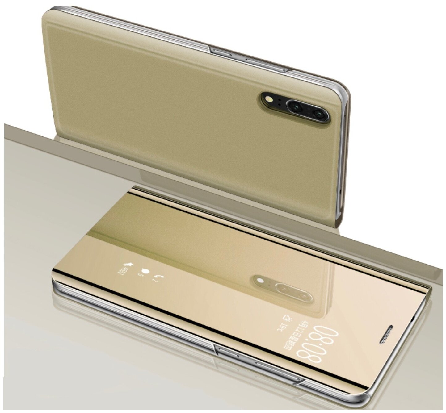 Чехол-книжка MyPads для Huawei P20 Lite / Nova 3e с дизайном Clear View Cover с полупрозрачной пластиковой крышкой с зеркальной поверхностью золотой интересное: