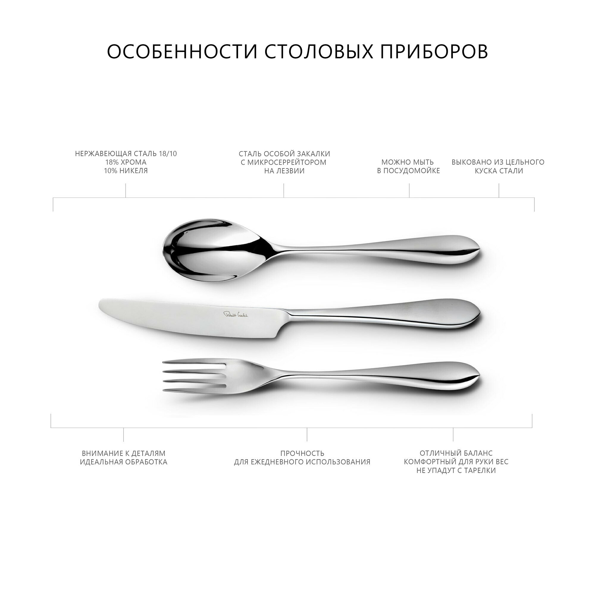| В набор входит | 6 столовых ножей, 6 столовых вилок, 6 столовых ложек, 6 чайных ложек |