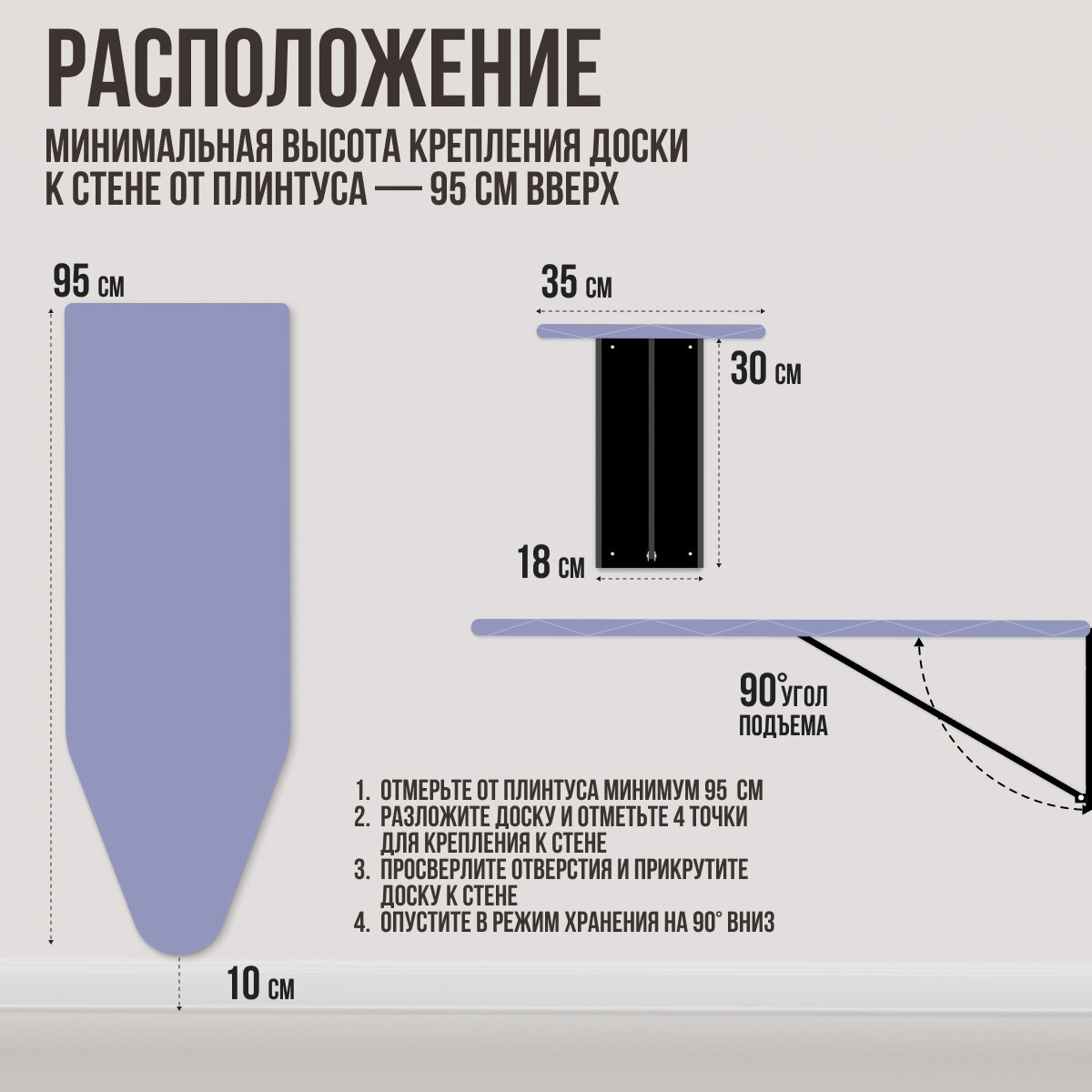 | Подробная комплектация | Гладильная доска настенная встраиваемая в шкаф, синий, 95х35 |
