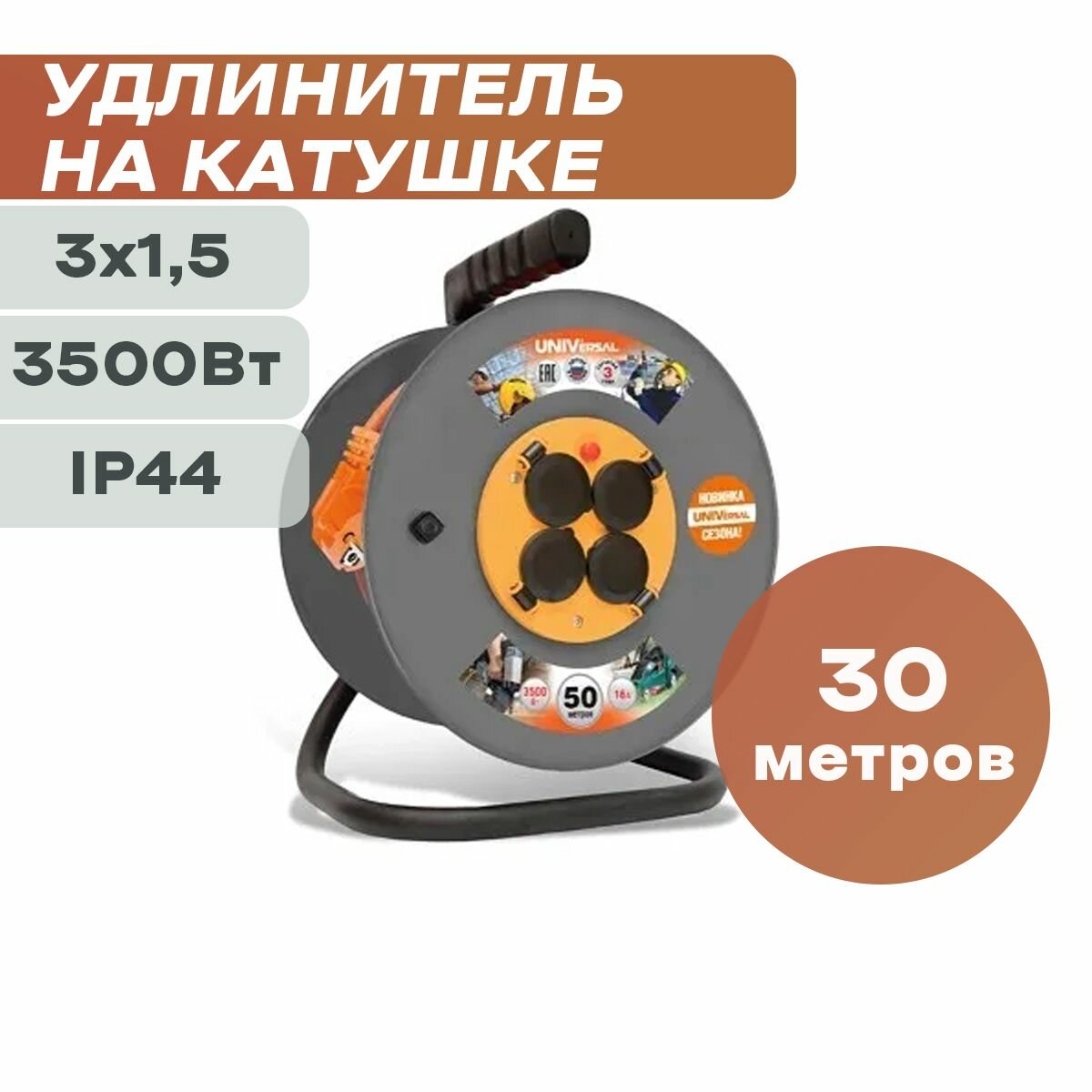 Удлинитель силовой на катушке UNIVersal Приоритет ВЕМ-250 (9634157) с заземлением 30 м 16 А 230 В 3,5 кВт 4 розетки ПВС 3х1,5 мм2 IP20 с защитными шторками