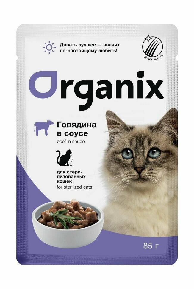 Купить ORGANIX для взрослых кастрированных котов и стерилизованных кошек с говядиной в соусе (85 гр х 25 шт)