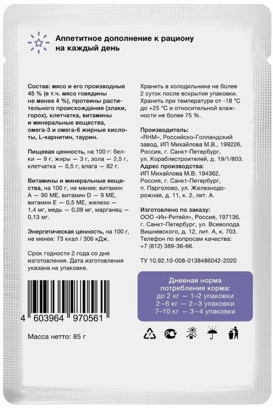 | Особые потребности | для стерилизованных/кастрированных / при чувствительном пищеварении |