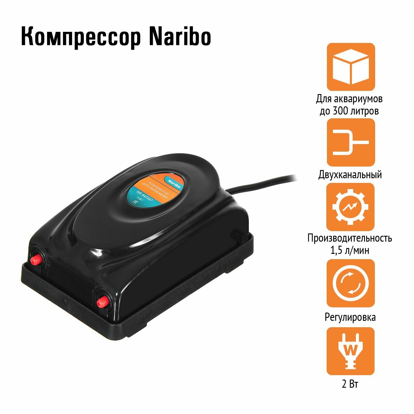 Компрессор Naribo, 2,5Вт, 2,5л/мин, для аквариума 100-150л