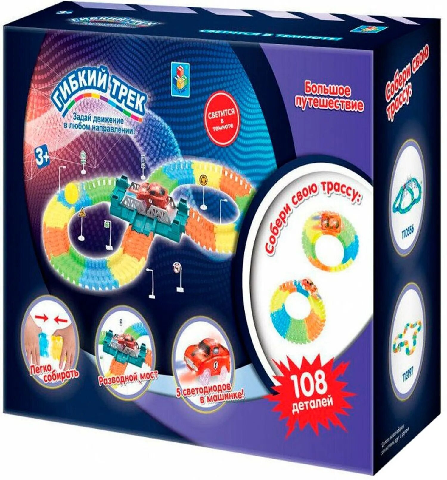 Игровой набор 1TOY Гибкий трек "Большое путешествие", 108 деталей, дорога светится в темноте