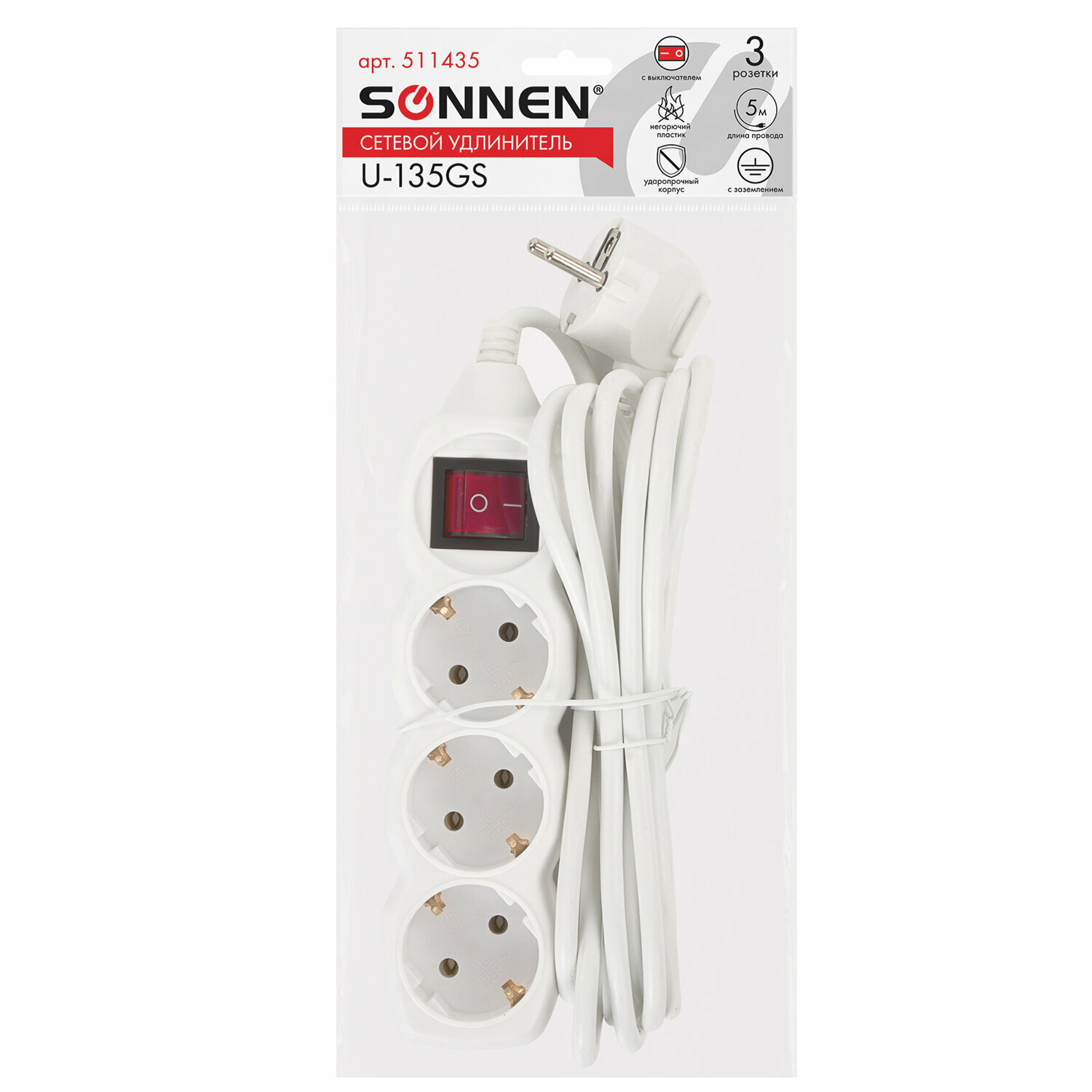 Купить Удлинитель сетевой SONNEN U-135GS, 3 розетки, c заземлением, выключатель, 10 А, 5 м, белый, 511435 (цена за 2 шт)