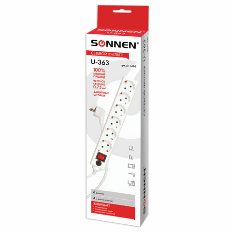 Ниже Вы можете прочитать отзывы на Сетевой фильтр SONNEN U-363, комплект 5 шт., 6 розеток, с заземлением, выключатель, 10 А, 3 м, белый, 511426, ознакомится с подробными характеристиками, посмотреть интересные обзоры и фотографии на Сетевой фильтр SONNEN U-363, комплект 5 шт., 6 розеток, с заземлением, выключатель, 10 А, 3 м, белый, 511426.