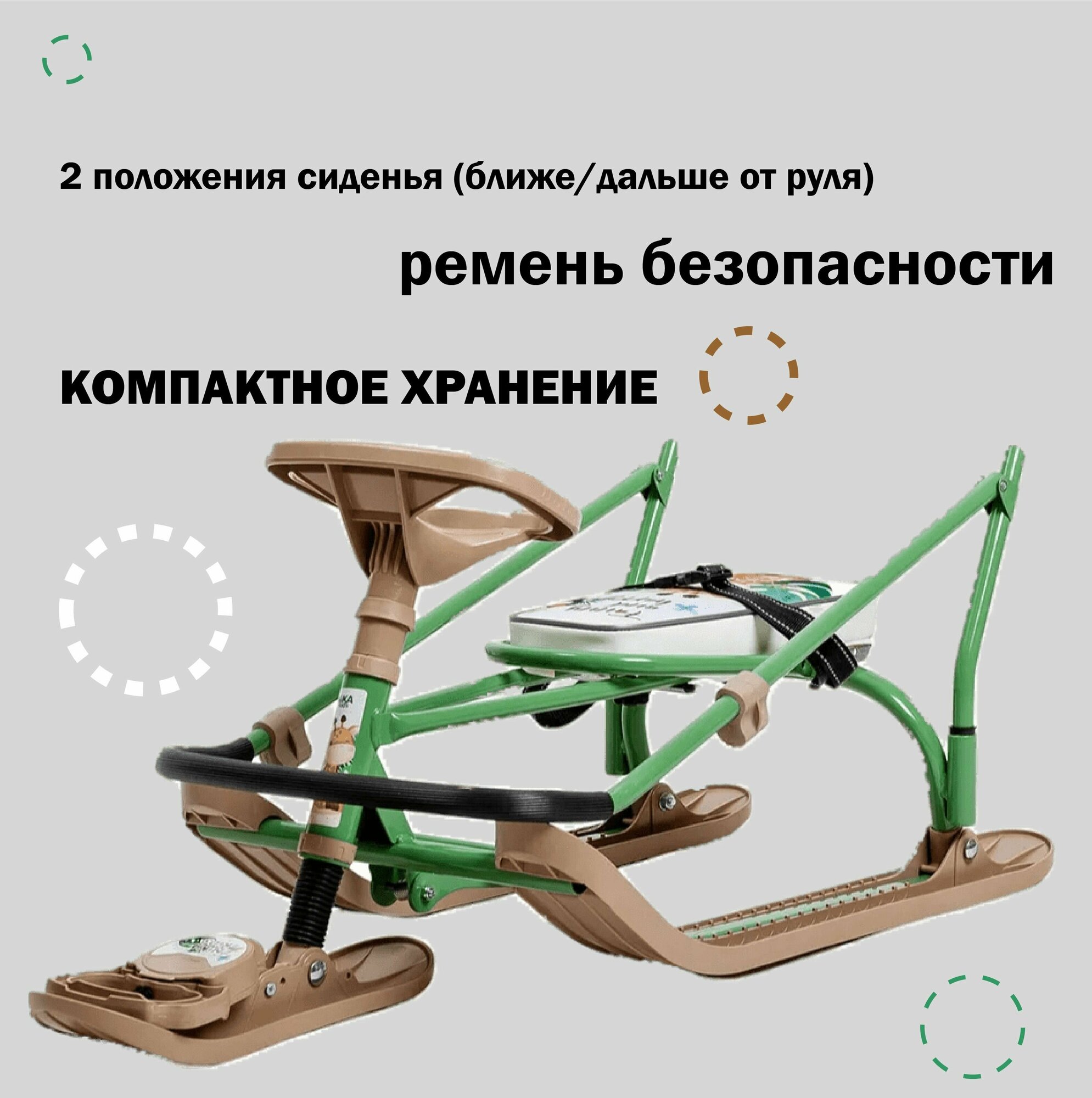 | Комплектация | металлический каркас, лыжи, сиденье со спинкой, руль, родительская ручка, трос |
