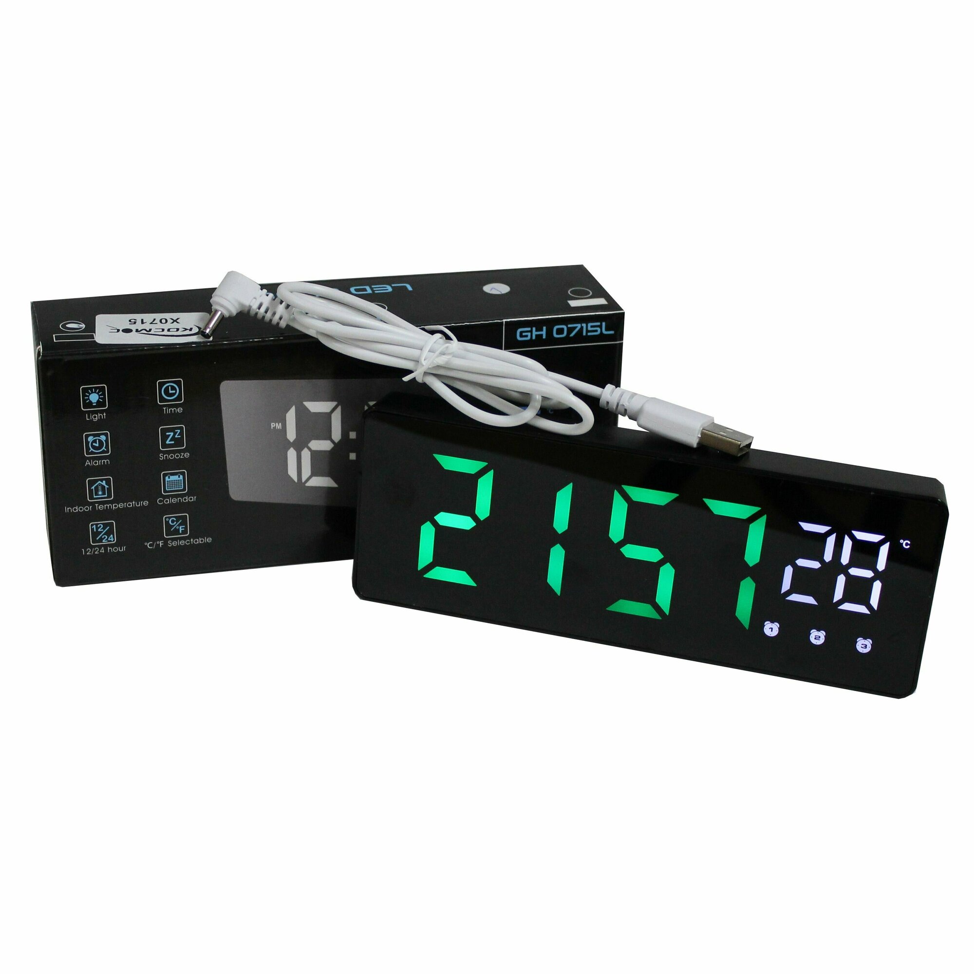 Часы электронные цифровые настольные с будильником, термометром и календарем (Космос X0715) белая / зелёная подсветка (черный корпуc)
