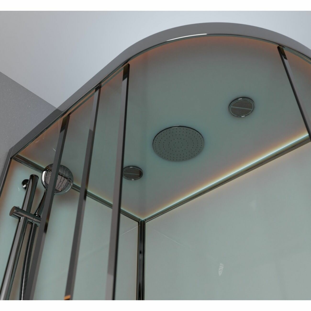 | Дополнительная информация | материал профилей: полированная сталь (полированный хром), колба сифона: ширина 90 мм (с ловушкой для волос и гидрозатвором), закалённые стёкла, безсиликоновая сборка, резьбовые соединения смесителя с душем, верхний душ (с резиновыми соплами от известков |