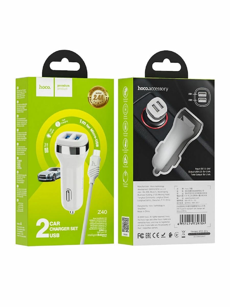 Автомобильное зарядное устройство, 2 USB 2.4A (Z40), usb cable micro, HOCO, белый