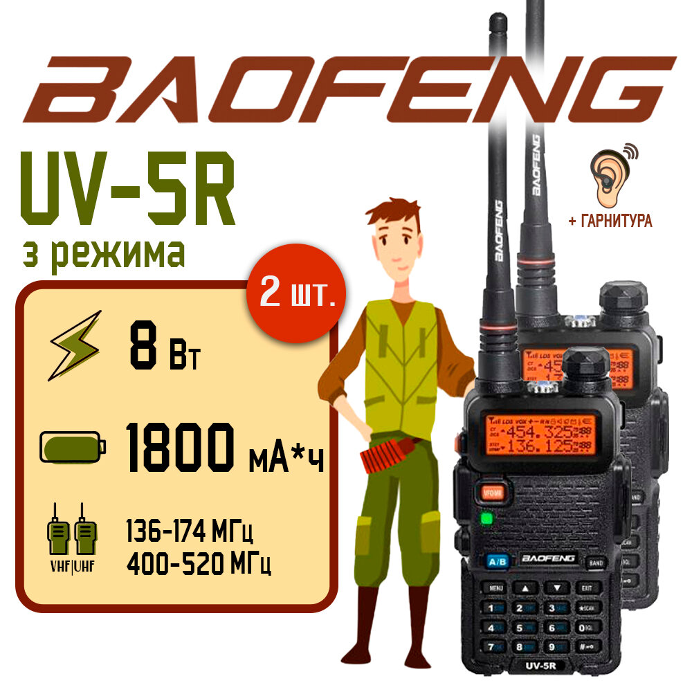 Рация Baofeng UV-5R 8W (3 режима мощности), комплект 2 шт. , 1800 мА*ч , радиус 10 км