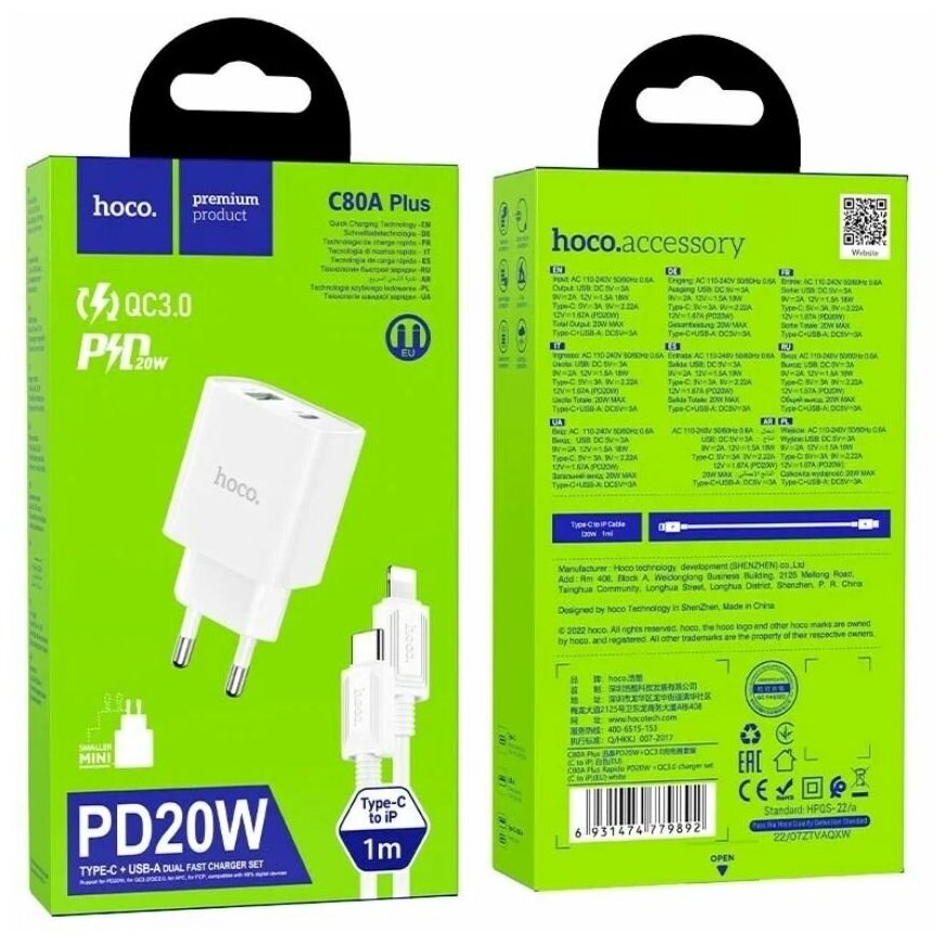 Сетевое зарядное устройство HOCO C80A Plus USB-C 20W + кабель Lightning 8pin, белый