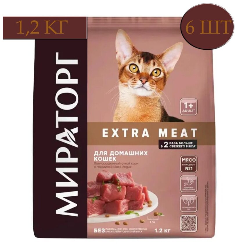Купить Сухой корм Мираторг EXTRA MEAT (6 упаковок х 1,2 кг) с говядиной Black Angus, для домашних кошек, старше 1 года/Полнорационный, холистик/ Оптом