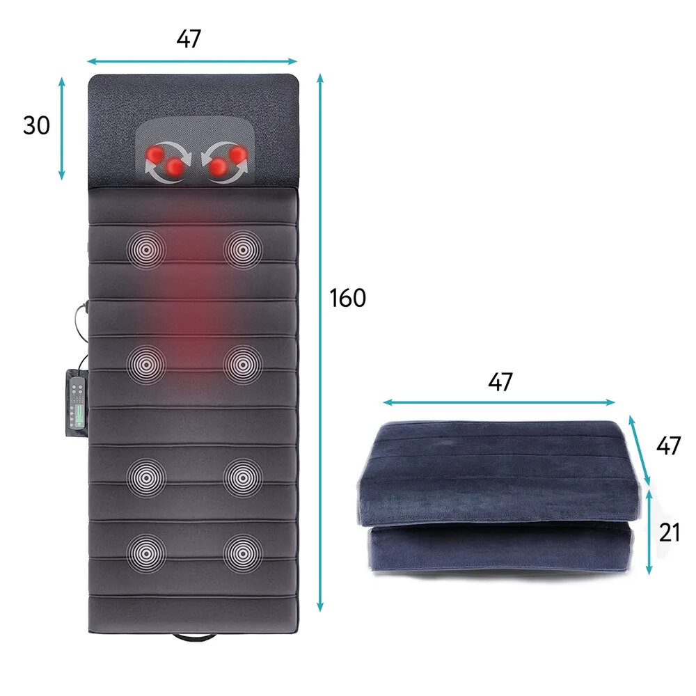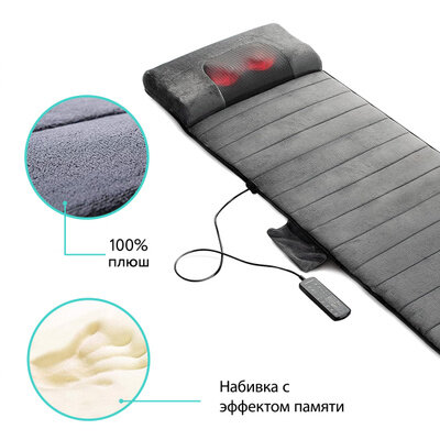Приобрёл массажный матрас для себя, так как последнее время часто болит спина. Имеется пульт дистанционного управления, удобен в использовании, можно спокойно хранить в шкафу, в тумбочке, так как он имеет складную конструкцию. Есть таймер, автовключение. Хорошо прогревает зону поясницы ног, функция прогрева встроена в массажный матрас. Работает от сети, всего имеет пять режимов, также встроена подушка. Матрас обладает эффектом памяти тела, что немаловажно. Есть инструкция. За данную цену оправдывает свои ожидания. Рекомендую!