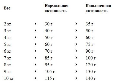 | Дозировка | - вес кошки 2кг - 30г - вес кошки 3кг - 40г - вес кошки 4кг - 50г - вес кошки 5кг - 60г - вес кошки 6кг - 70г - вес кошки 7кг - 85г - вес кошки 8кг - 95г - вес кошки 9кг - 105г - вес кошки 10кг - 115г |