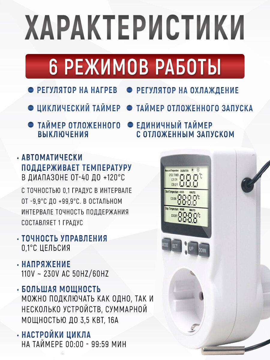 Терморегулятор / термостат / Умная розетка / с выносным датчиком / с таймером для отопления, конвекторов, теплицы, аквариумов интересное: