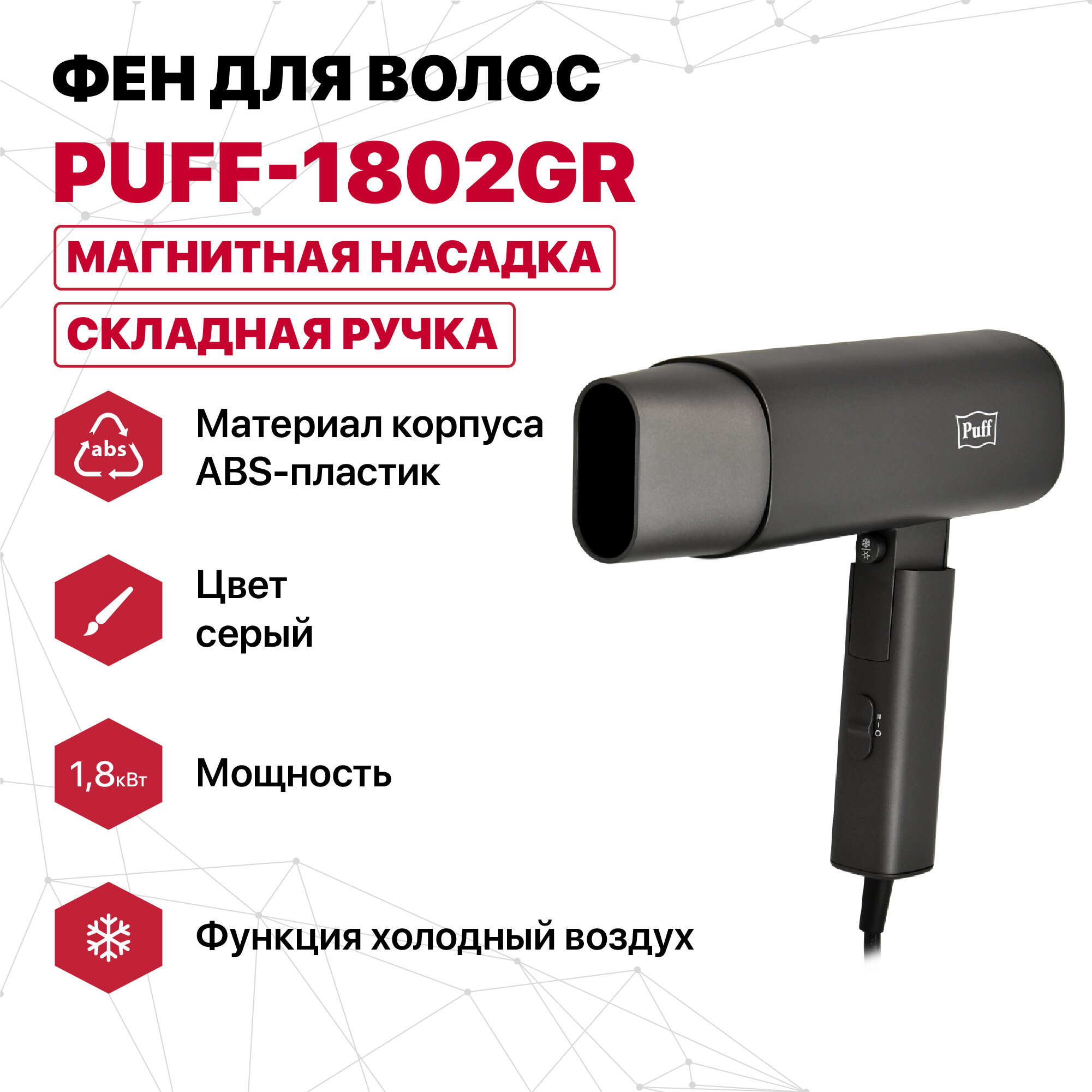 Фен для волос Puff-1802Gr, серый, 1,8 кВт, Арт.:1405.028 интересное: