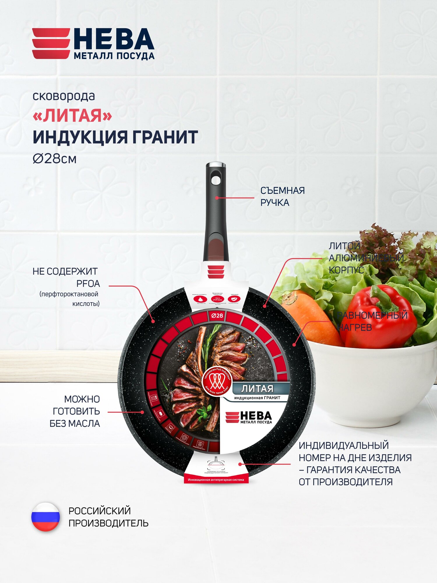 СохранитьСковорода Нева Металл Посуда НМП литая Индукция Гранит со съемной ручкой 28 см, L18028i интересное: