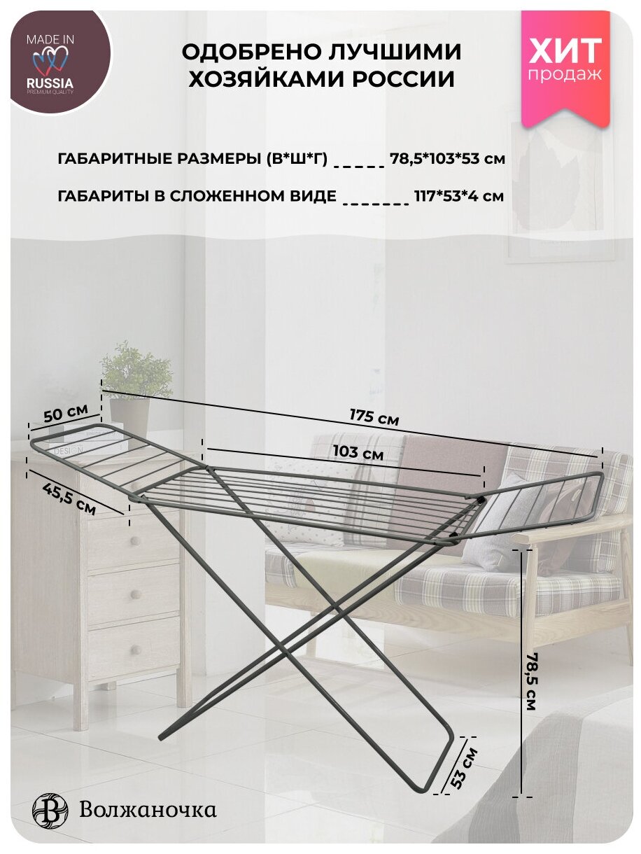 Волжаночка Сушилка для белья "Сказка" складная напольная, 175х53 см., цвет серый металик