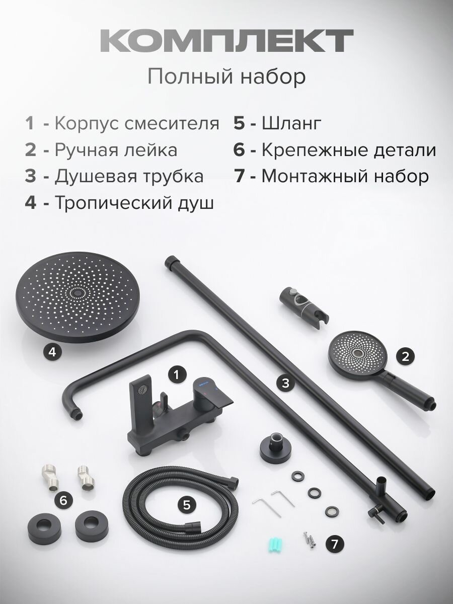 | Комплектация | душевая лейка / шланг для душа / верхний душ / душевая стойка |