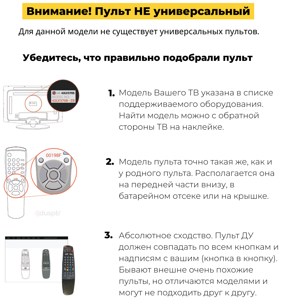 | Дополнительная информация | Внимание! Данный пульт RC44F H-LED22V1 / H-LED24V5 не универсальный. Он совместим только с телевизорами из списка поддерживаемого оборудования! Подробный список поддерживаемого оборудования смотрите в «Назначении». Для Вашего удобства мы также добавили инструкции по подборке пультов. Пожалуйста, ознакомьтесь с ними перед покупкой. Можете задавать вопросы, мы незамедлительно поможем подобрать пульт для Вашего ТВ. |