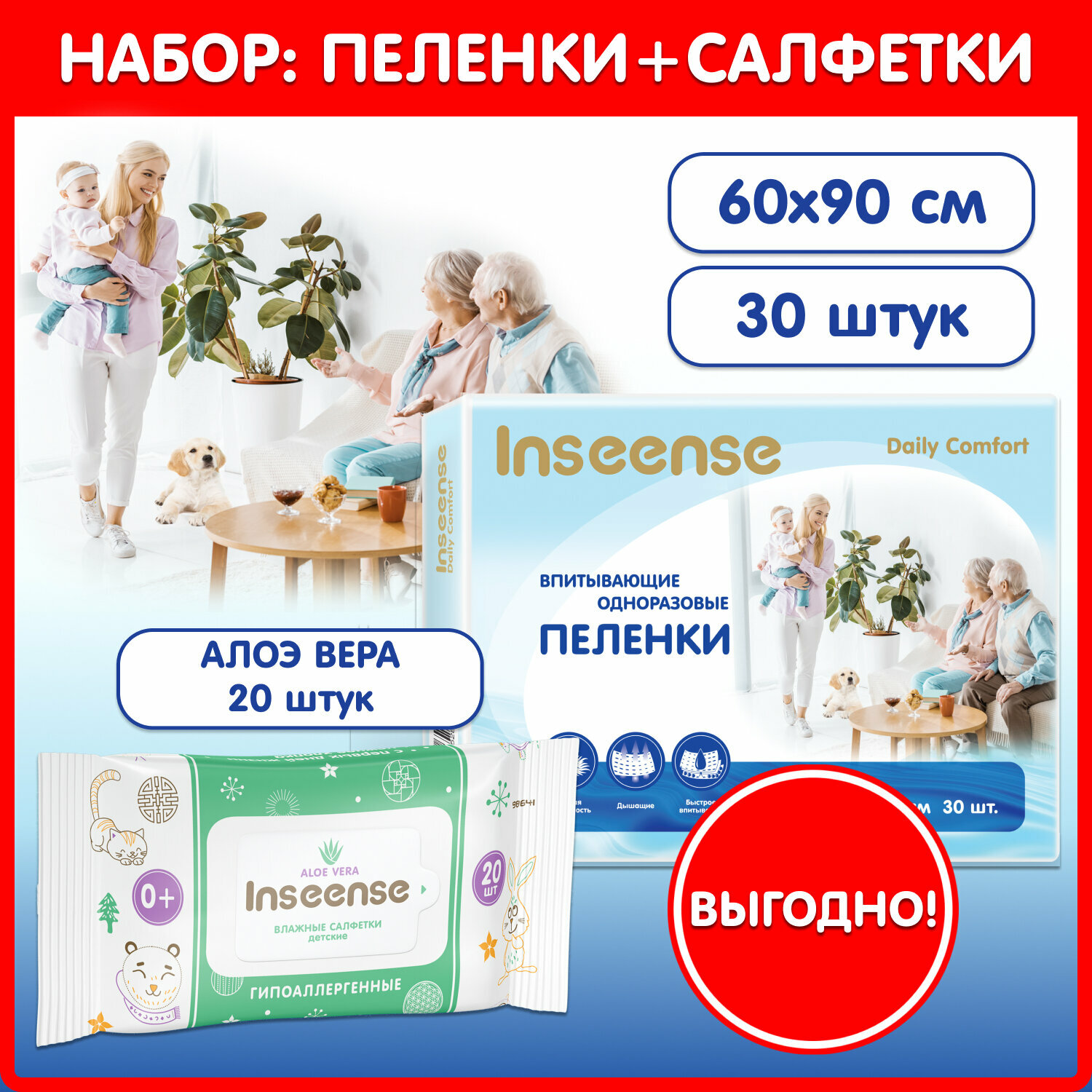 Купить Пеленки Daily Comfort 60х90 см 30 шт +салфетки Inseense алоэ 20 шт