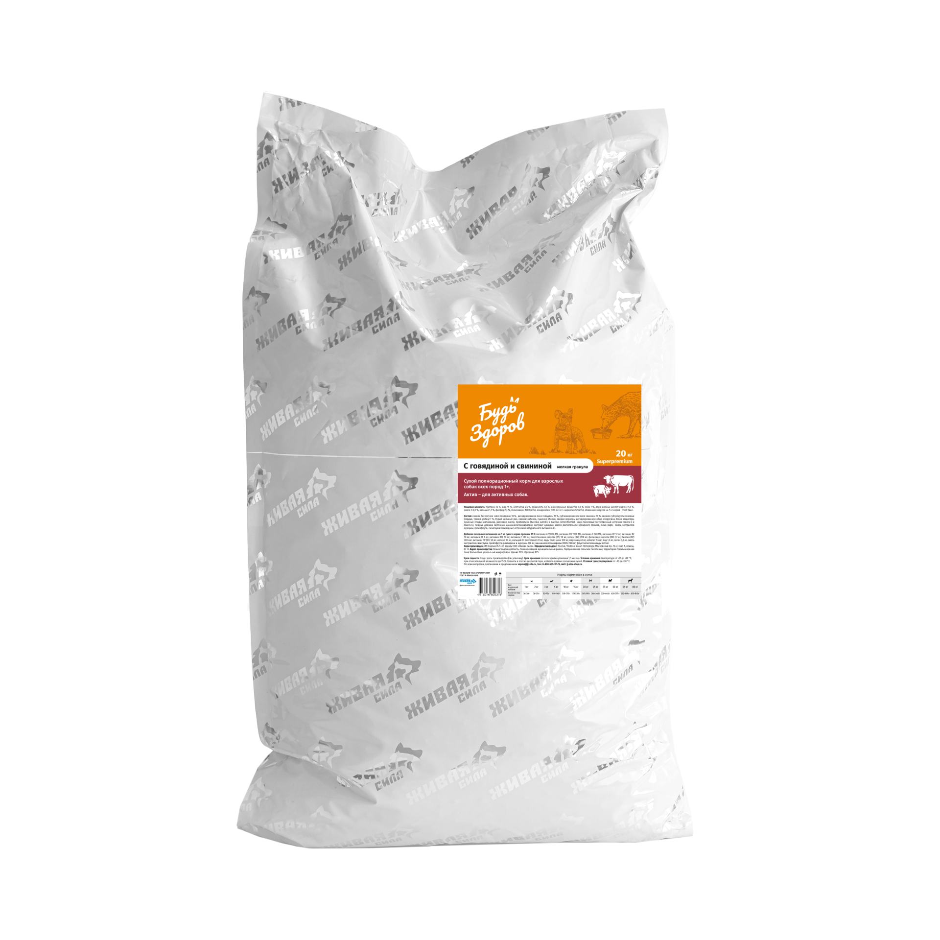 Будь ЗДОРОВ_ЖИВАЯ сила Корм для взрослых собак всех пород от 1 года с говядиной и свининой, Мелкая гранула (20 кг)