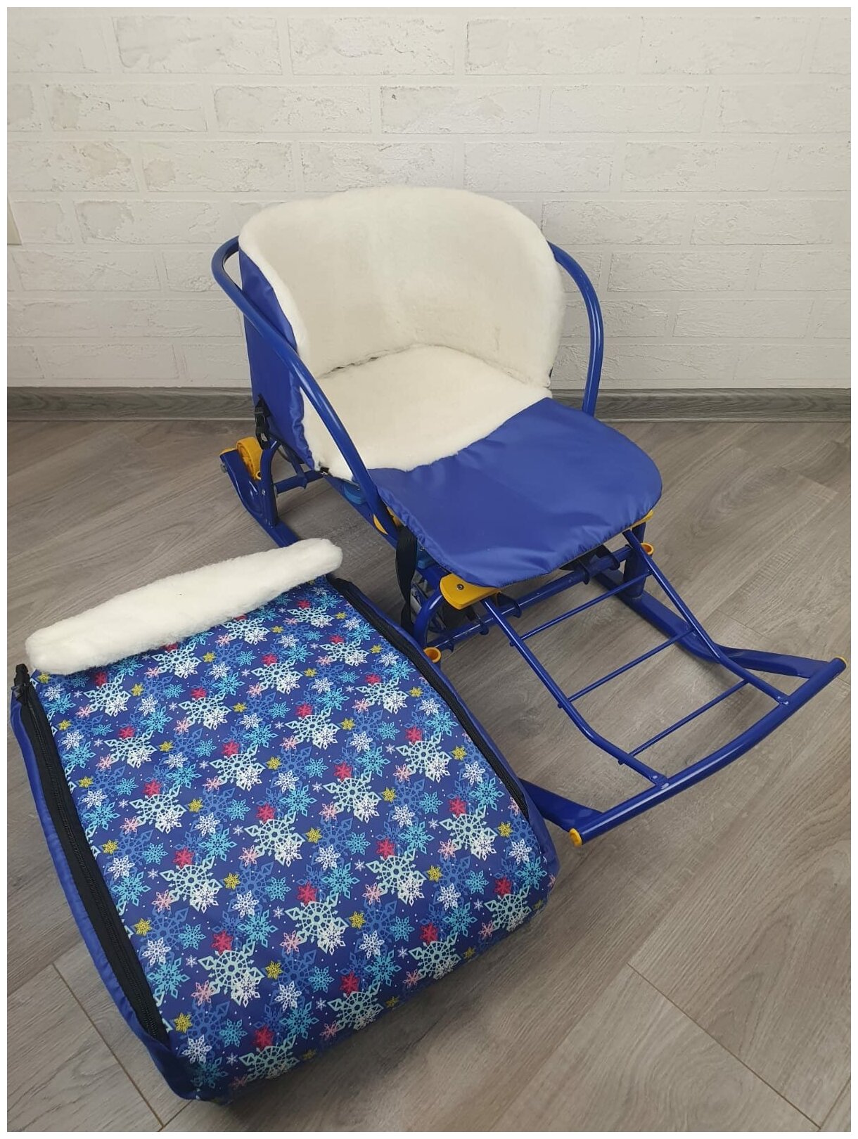 Матрасик для санок меховой 3 в 1 Снежинки на синем бок голубой мех белый