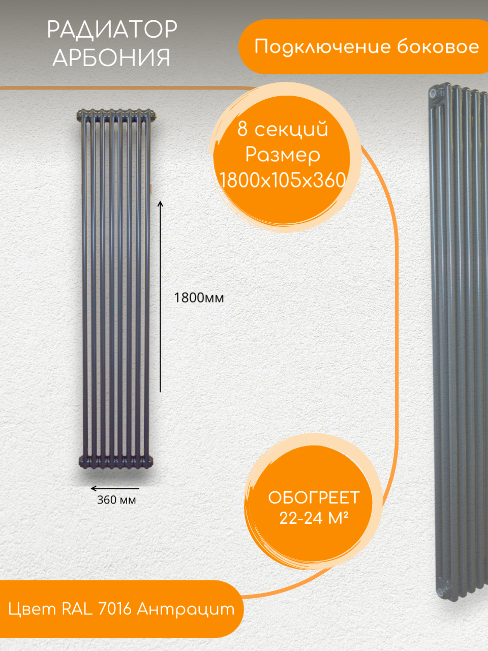 Стальной трубчатый Радиатор Arbonia 3180, Боковое подключение; Количество секций: 8 RAL 7016 интересное: