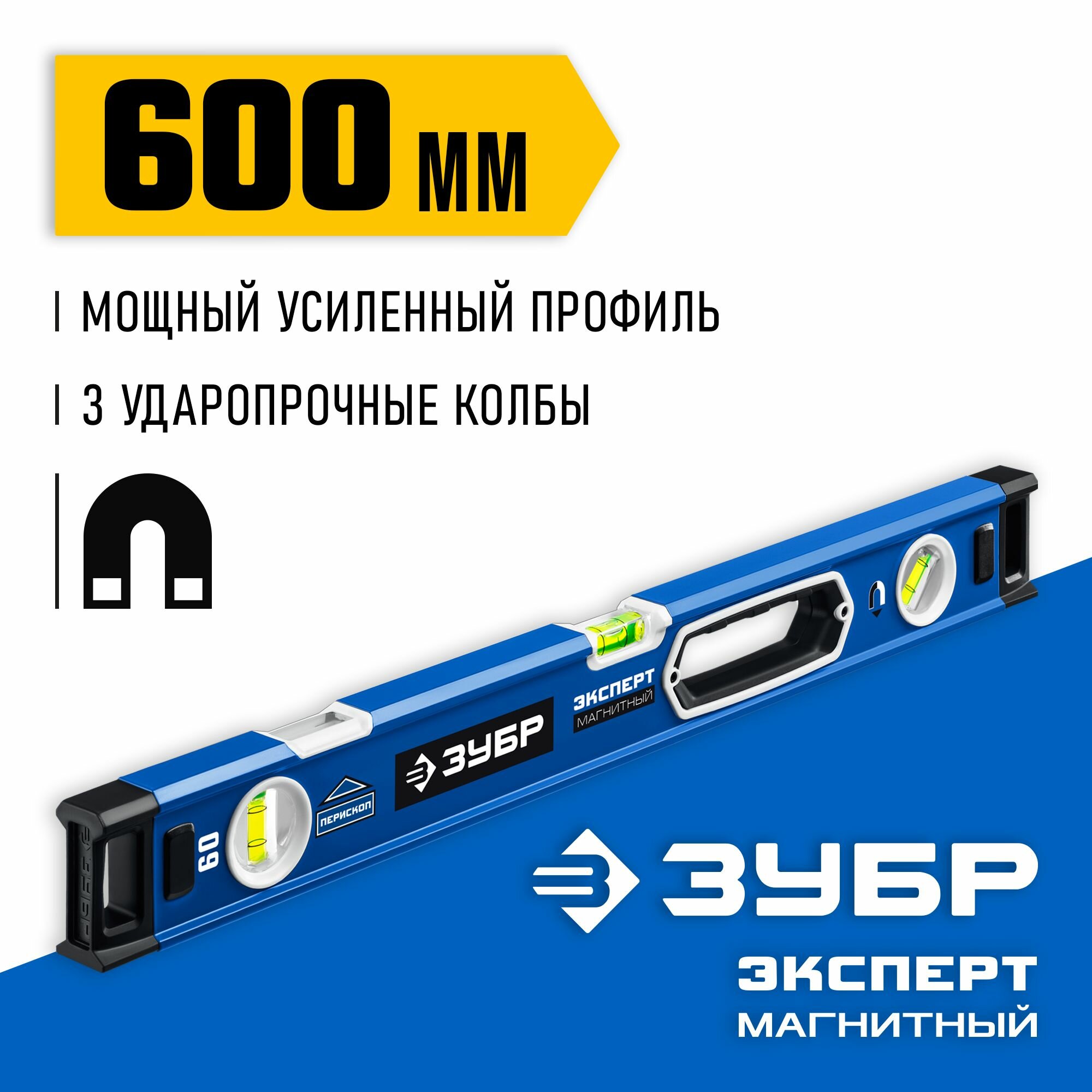 Купить Мощный магнитный уровень ЗУБР 600 мм с рукоятками и зеркальным глазком Эксперт-М