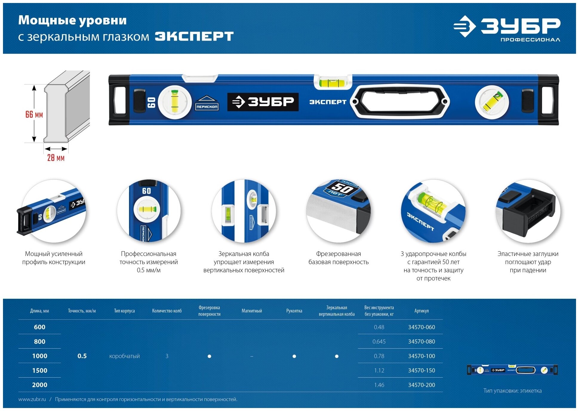 ЗУБР эксперт, 1000 мм, с зеркальным глазком, уровень с усиленным профилем, Профессионал (34570-100)