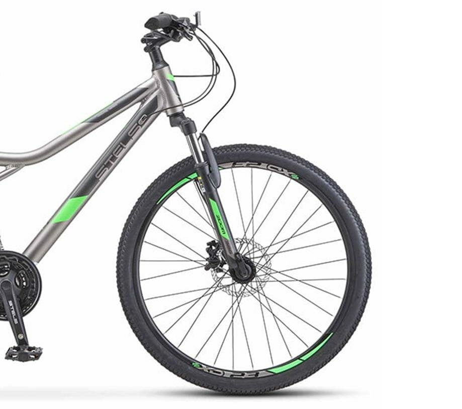 Велосипед горный с колесами 26" Stels Navigator 610 D V020 серый/зеленый рама 16", 21 скорость интересное: