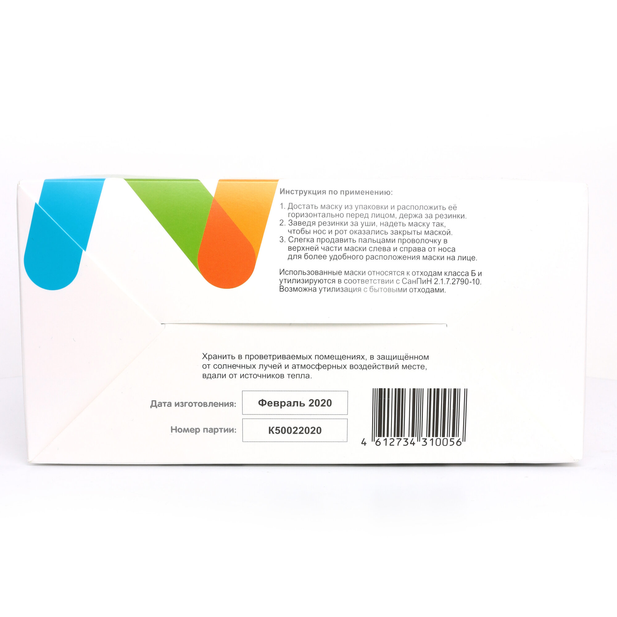 | Комплектация | Маска одноразовая с носовым фиксатором, заушными резинками, в упаковке 50 штук |