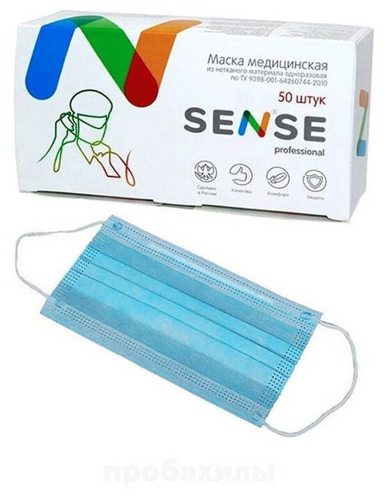Маска медицинская SENSE Professional одноразовая трехслойная, 50 шт., голубой
