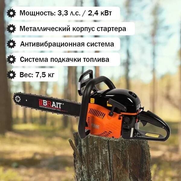 Бензопила BRAIT 4518В (18', 0,325, 1,5 72 зв. 2,5л. с. стартер металлический, легкий пуск)
