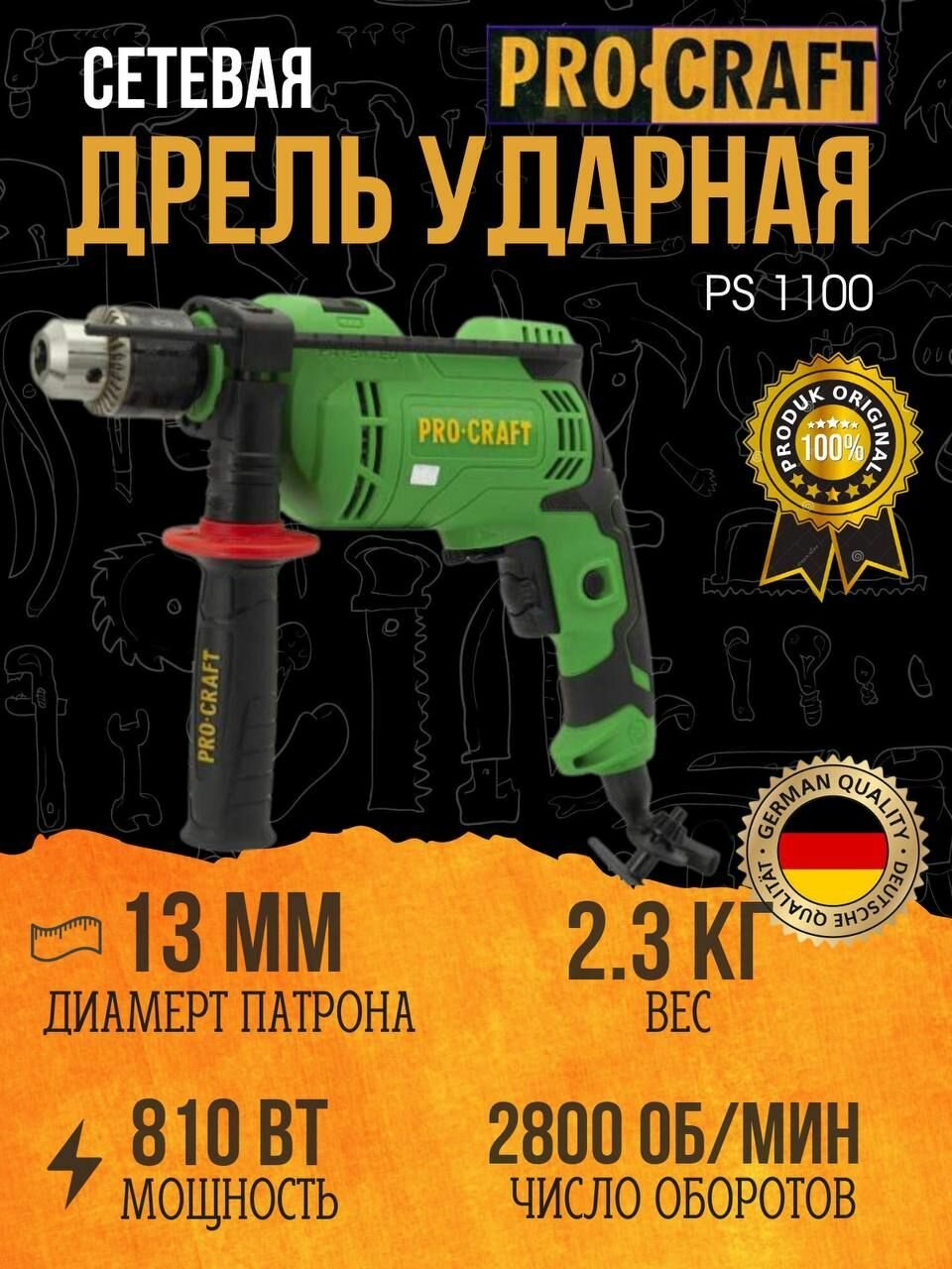 Дрель ударная Procraft PS-1100, патрон 13мм, 3000об/мин, 810Вт
