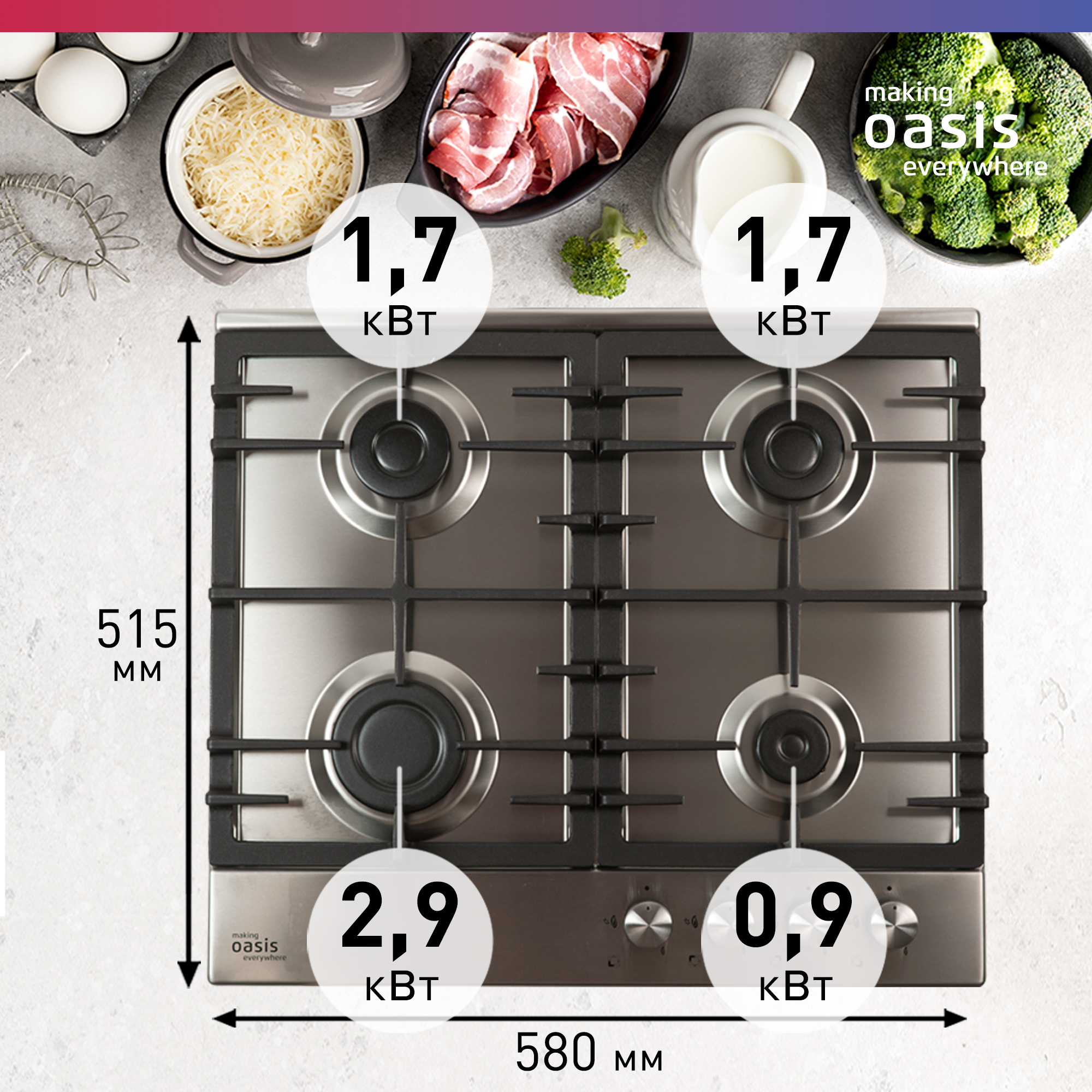 Газовая поверхность making Oasis everywhere P-MNP, 60 см, решетки: чугунные, нержавеющая сталь, Турция
